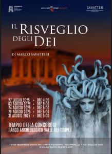 Lungo la via Sacra, tra il Tempio della Concordia e quello di Giunone, il pubblico sarà guidato in un cammino tra i miti del passato. Gli attori in costume, tra recitazione, danza e canto, tra la luce nascente e le vestigia dell’antichità, daranno voce alle storie di dei ed eroi, rievocando un tempo sospeso dove le leggende si intrecciano con la realtà contemporanea con tematiche eterne come amore, odio, guerra. I miti millenari risuoneranno con forza rinnovata: lo spettacolo, infatti, non è sempre uguale a se stesso, ma risente a ogni nuovo appuntamento di modifiche e integrazioni. Il cast, quest’anno, conterà anche alcuni attori americani che sono stati selezionati dallo stesso Savatteri nel contesto di un progetto con la Montclair State University curato dalla professoressa Teresa Fiore.
