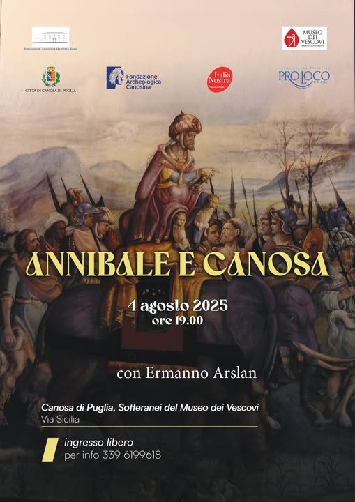 Lunedì 4 agosto 2025, alle 19, a Canosa di Puglia (BAT), nello spazio sotterraneo del museo dei Vescovi, in via Sicilia, l’incontro “Annibale e Canosa” con Ermanno Arslan, promosso da Fondazione Antonio e Marietta Rossi e Museo dei Vescovi, in collaborazione con il Comune di Canosa, Fondazione Archeologica Canosina, Italia Nostra e Pro Loco. Ingresso libero. Il prof. Ermanno Arslan, storico, numismatico, archeologo. Accademico dei Lincei, studioso di fama internazionale, sarà il protagonista di un incontro dedicato alla figura del grande condottiero cartaginese, uno dei più geniali del mondo antico, e ai suoi rapporti con il mondo italico in generale e apulo e magnogreco in particolare. Si ripercorreranno con il pubblico le tappe avventurose del suo mitico viaggio dall’Africa attraverso la Spagna e la Francia e poi in Italia lungo l’Appennino fino alle coste adriatiche e ai noti eventi conclusi in Daunia con la sanguinosa vittoria del 216 a.C. a Canne sul nemico romano, a cui fecero seguito grandi cambiamenti economici e sociali nel territorio apulo. Un viaggio disegnato oltre che dagli eventi bellici affrontati anche dalla fisionomia psicologica e culturale del personaggio e dalla sua visione politica e strategica del Mediterraneo nel III secolo a.C. E del Mediterraneo Annibale rimane figura storica di riferimento, nel segno dei simboli e dei miti che ne collegano, in un unico orizzonte culturale, le genti e i paesi.