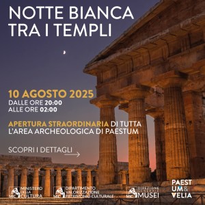 Le aspettative erano tante, l’offerta ricca e diversificata, e il pubblico ha risposto alla grande affluendo numeroso nell’area archeologica di Paestum il 10 agosto 2025, nella notte di san Lorenzo, per la Notte Bianca tra i Templi, edizione 2025 (vedi https://archeologiavocidalpassato.com/2025/08/10/paestum-sa-nella-notte-di-san-lorenzo-la-iv-edizione-della-notte-bianca-tra-i-templi-lintera-area-archeologica-si-trasforma-in-un-grande-palcoscenico-a-cielo-aperto-dov/). La direzione dei Parchi archeologici di Paestum e Velia ha vooluto riassumere per immagini il successo dell’iniziativa con un breve video: “È stata un’esperienza unica e intensa”, commenta il direttore Tiziana d’Angelo. “Tra giochi di luci, voci, danze, suoni e visioni, il Parco si è trasformato in uno spazio vivo, dove il passato ha incontrato il presente e l’arte ha parlato al cuore. Un grazie speciale a chi ha vissuto con noi questa notte speciale sotto le stelle”.