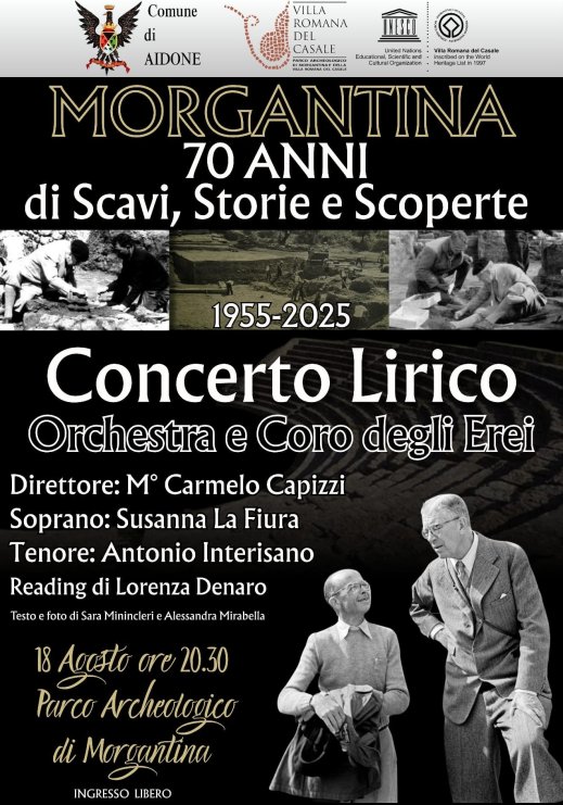 Il 18 agosto 1955, in contrada Serra Orlando (Morgantina, Aidone, En), ebbero inizio gli scavi sistematici condotti dalla missione americana della Princeton University, sotto la direzione degli archeologi Erik Sjöqvist e Richard Stillwell. Le fotografie di quel giorno raccontano con chiarezza quanto orgoglio e partecipazione la gente di Aidone mise in quell’evento: un’intera comunità riunita attorno alla rinascita di Morgantina. Il 18 agosto 2025, a 70 anni esatti da quel momento, al parco archeologico di Morgantina si rivive quello stesso spirito: “Morgantina, 70 anni di scavi, storie e scoperte. 1955-2025”, una giornata di memoria, festa e identità condivisa. Alle 20.30, Concerto lirico con l’orchestra e coro degli Erei, direttore m° Carmelo Capizzi, soprano Susanna La Fiura, tenore Antonio Interisano. Reading di Lorenza Denaro. Testo e foto di Sara Minicleri e Alessandra Mirabella. L’evento è organizzato dal parco archeologico Morgantina-Villa Romana del Casale e dal Comune di Aidone. Ingresso libero.