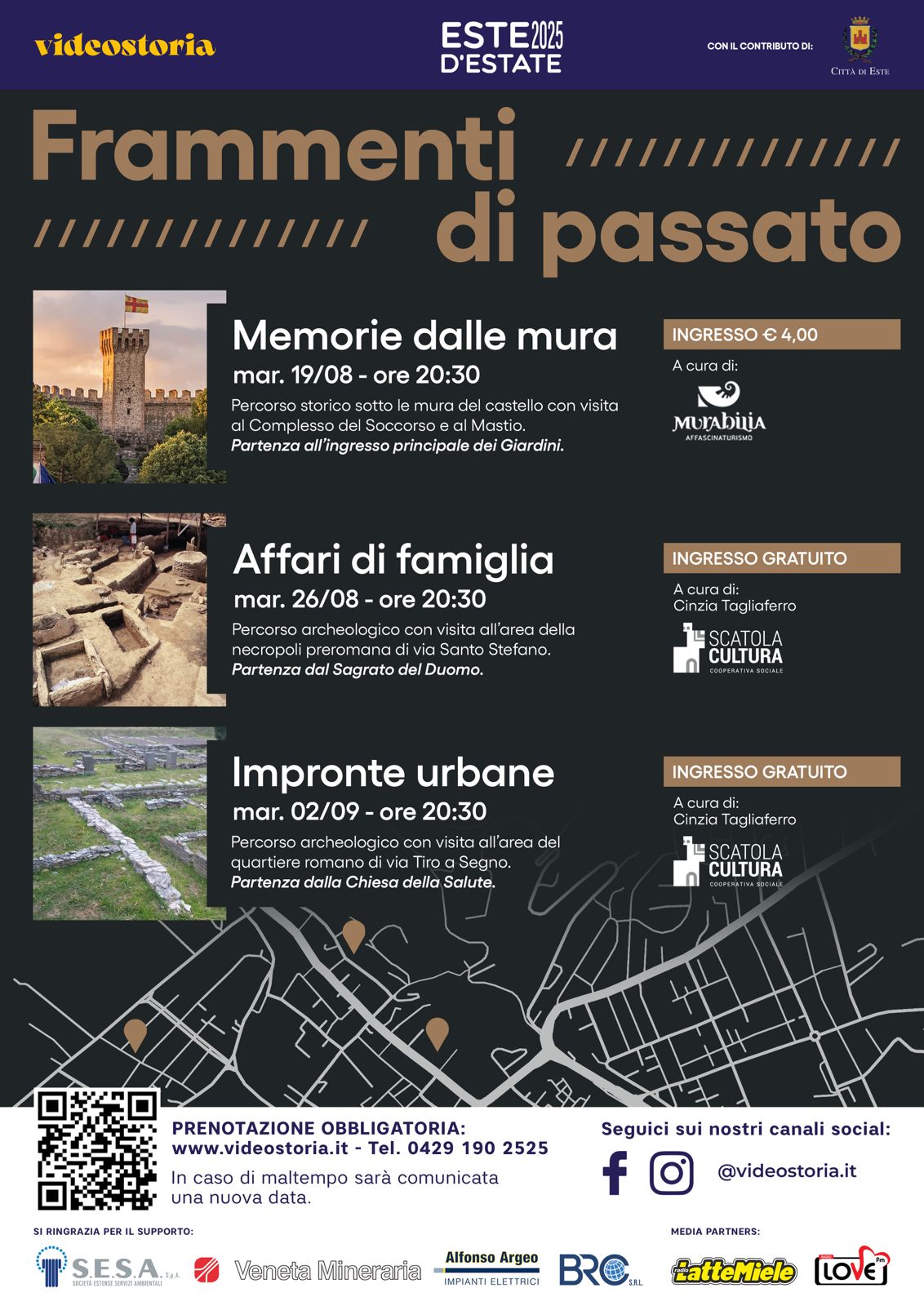 Si inizia con “Memorie dalle Mura”, martedì 19 agosto 2025, alle 20.30: passeggiata storica sotto le mura del Castello di Este, con visita alle torri del Mastio e del Soccorso a cura di Mirabilia. Posti limitati. Partenza dall’ingresso principale dei Giardini. Ingresso 4 euro. Si continua con “Affari di famiglia”, martedì 26 agosto 2025, alle 20.30: passeggiata archeologica alla scoperta della necropoli preromana di via Santo Stefano, a cura di Cinzia Tagliaferro. Partenza dal sagrato del Duomo. Ingresso libero. Si chiude con “Impronte urbane”, martedì 2 settembre 2025, alle 20.30: passeggiata archeologica alla scoperta del quartiere residenziale romano di via Tiro a Segno, a cura di Cinzia Tagliaferro. Partenza dalla Chiesa della Salute. Ingresso libero.