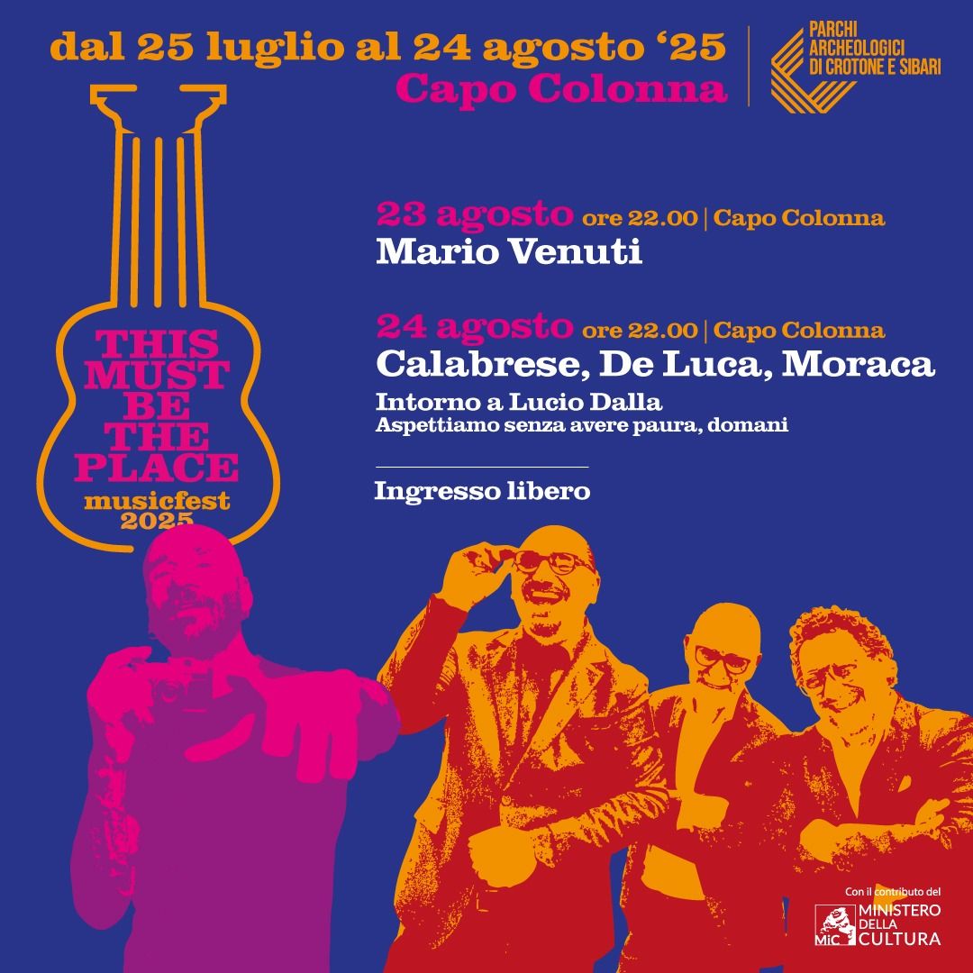Ultimi due appuntamenti della rassegna “This must be the place” nello scenario unico: il Parco archeologico di Capo Colonna. Ingresso gratuito. Sabato 23 agosto 2025, alle 22, Mario Venuti in “Jazz Mood”: dal pop raffinato al jazz fino al Brasile, un viaggio musicale in quartetto, con il suo stile inconfondibile e la voglia di sorprendere. Domenica 24 agosto 2025, alle 22, “Aspettiamo senza avere paura, domani – Intorno a Lucio Dalla”, un omaggio emozionante al genio di Lucio: musica, parole e teatro si intrecciano in un racconto fatto di canzoni, aneddoti e poesia. Quest’ultimo evento, inizialmente previsto alla fortezza di Le Castella, si tiene dunque al parco archeologico di Capo Colonna.