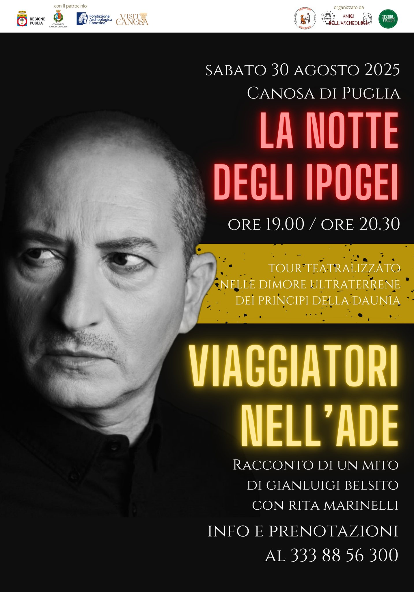 “Siete incuriositi dal mondo dauno e dalle tombe dei principes? Vorreste visitare un ipogeo con realtà spaziale aumentata? Siete affascinanti dalla mitologia?” si chiede l’associazione Amici dell’Archeologia. Appuntamento a Canosa di Puglia (BAT) sabato 30 agosto 2025, alle 19 o alle 20.30, per “La Notte degli Ipogei”, organizzato nell’ambito de “Le Notti dell’Archeologia 2025” dall’associazione Amici dell’Archeologia, con il patrocinio della Fondazione Archeologica Canosina, di Visit Canosa, del Comune di Canosa di Puglia e della Regione Puglia. Questo l’itinerario delle passeggiate archeologiche delle 19 e delle 20.30: IPOGEO DI VICO SAN MARTINO (IV sec. a.C. – III sec. a.C.); IPOGEO D’AMBRA (IV sec. a.C.), tomba scavata nel banco argilloso; IPOGEO DEL CERBERO (III sec. a.C.) dove l’affresco raffigurante il mitologico cane Cerbero prenderà vita grazie a tecnologie di realtà spaziale aumentata; IPOGEO LAGRASTA I (IV sec. a.C. – I sec. d.C.). Il più importante complesso funerario di Canosa e dell’intera regione, composto da tre tombe a camera. Alla fine di ogni passeggiata archeologica, i partecipanti potranno assistere alla visita guidata teatralizzata “Viaggiatori nell’Ade” di Gianluigi Belsito de “Il Teatro del Viaggio” con Rita Marinelli, all’interno degli ipogei Lagrasta, suggestiva scenografia naturale. Scenderanno negli inferi per incontrare Paolo e Francesca, Enea e Didone, Orfeo ed Euridice tre coppie di amanti tra i più celebri che sono scesi nell’Ade, alcuni facendone ritorno, altri restando laggiù per l’eternità. Saranno presenti, inoltre, le artiste dell’associazione “Arteinessere-Essereinarte”, le quali realizzeranno in live painting opere d’arte. Info e prenotazioni contattando il 3338856300, anche tramite messaggistica istantanea WhatsApp. Con il ticket sarà inoltre possibile usufruire di menù convenzionati presso ristoranti locali.