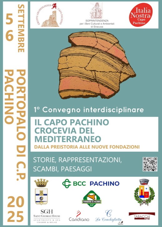 PROGRAMMA DI VENERDÌ 5 SETTEMBRE 2025. Pachino – Dimora Savarino: alle 14.30, registrazione partecipanti e saluti Istituzionali. PRESIEDE A. CASTORINA: alle 16, G. Ancona, E. Messina, “L’attività svolta dalla Soprintendenza nella cuspide sudorientale della provincia di Siracusa”; 16.20, M. Cultraro, “Rileggendo la grotta Corruggi (Pachino, Sr) attraverso i documenti inediti di Luigi Bernabò Brea”; 16.40, M. Fitula, “Isola di Capo Passero, ritrovamenti archeologici e nuove prospettive di ricerca”; 17, G. Ancona, A. Licciardello, E. Messina, “Una tomba dell’età del Rame da contrada Granelli”; 17.20, pausa caffè; 17.50, S. Lupo, “Il Capo Pachino tra continuità e discontinuità. Una proposta di lettura”; 18.10, C. Sgandurra, “Il Capo Pachino: aspetti del paesaggio vegetale e fattori antropici”; 18.30, G. Assenza, R. Lopez, F. Trapani, “Testimonianze archeologiche note nel territorio del Capo Pachino e loro stato attuale”; 18.50, discussione.