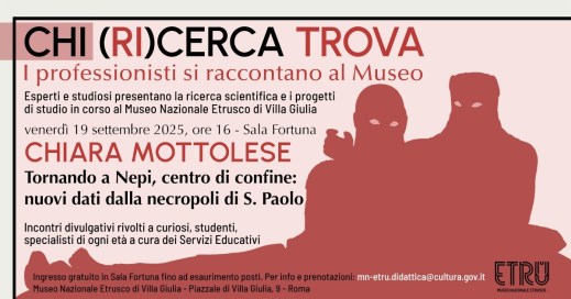 “Tornando a Nepi, centro di confine: nuovi dati dalla necropoli di S. Paolo”: settimo appuntamento del 2025 con il ciclo “Chi (RI)cerca trova. I professionisti si raccontano al Museo”, in cui si presentano la ricerca scientifica e i progetti di studio che coinvolgono il museo nazionale Etrusco di Villa Giulia. Venerdì 19 settembre 2025, alle 16, Chiara Mottolese porta i partecipanti a scoprire nuovi dati dalla necropoli di S. Paolo. Ingresso gratuito in Sala Fortuna fino ad esaurimento posti. Prenotazioni all’indirizzo mn-etru.didattica@cultura.gov.it. Nella conferenza verranno esplorate tre tombe a camera, sostanzialmente inedite, rinvenute nel sepolcreto di San Paolo di Nepi e databili fra l’età orientalizzante e quella arcaica, individuate nel corso di uno scavo d’emergenza a tutela del territorio, diretto da D. Rizzo nel 1992, per conto dell’allora Soprintendenza dell’Etruria meridionale. L’analisi dei contesti, che si inserisce nel quadro di un più ampio progetto di ricerca, ha preso avvio dalla documentazione archivistica e fotografica ed è proseguito con lo studio dei materiali dei corredi funerari conservati nei depositi del museo nazionale etrusco di Villa Giulia. I risultati di questa ricerca offrono un’ulteriore testimonianza della cultura artigianale e della ritualità funeraria, che contribuisce a delineare i tratti caratteristici della comunità nepesina, evidenziando gli aspetti di continuità e diversità con le realtà circostanti di area falisca, etrusca e capenate.