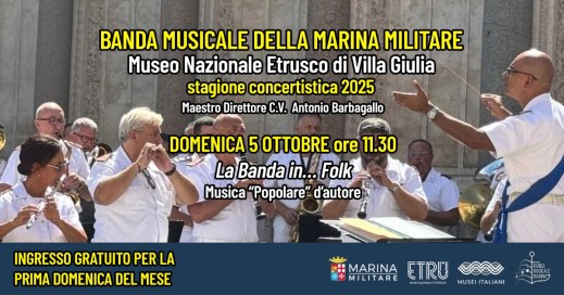 Domenica 5 ottobre 2025, alle 11.30, al museo nazionale Etrusco di Villa Giulia, concerto della banda Musicale della Marina Militare Italiana in occasione di #domenicalmuseo, la prima domenica del mese ad ingresso gratuito. Il direttore Capitano di Vascello Maestro Antonio Barbagallo dirigerà la Banda Musicale della Marina Militare in “La Banda in… Folk. Musica popolare d’autore”. Ingresso gratuito senza prenotazione.