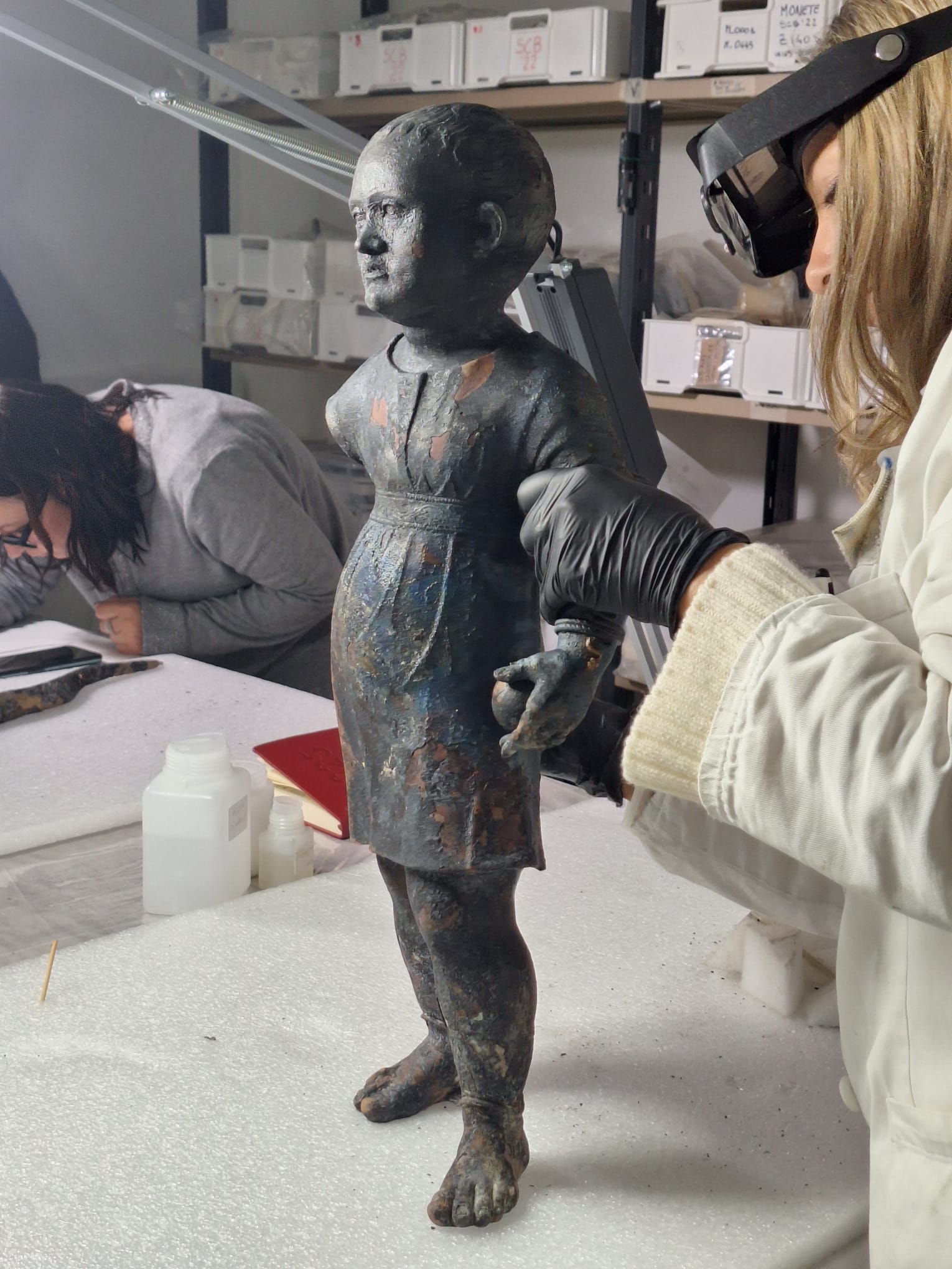 Bambino con la sfera a fine restauro: bronzo da San Casciano nel laboratorio ABAP di Grosseto (foto mic)