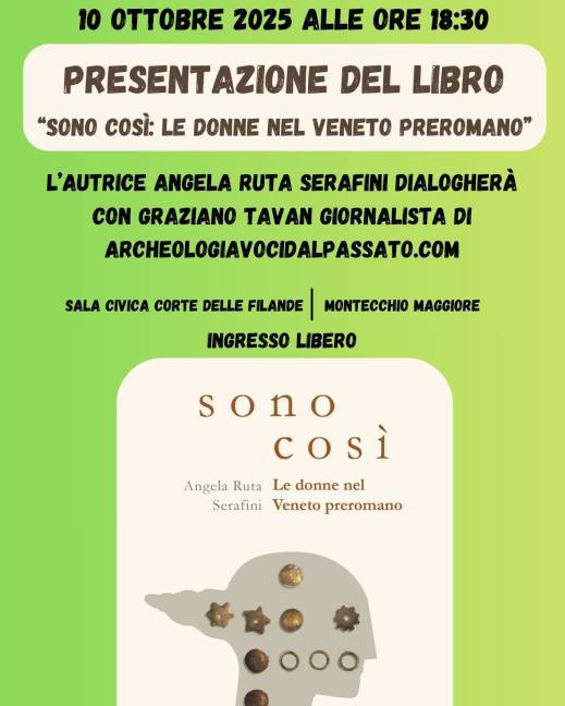 È un viaggio affascinante alla scoperta delle figure femminili del Veneto preromano quello che propone il museo di Archeologia e di Scienze naturali “G. Zannato” di Montecchio Maggiore (Vi) con la presentazione del libro “Sono così: le donne nel Veneto preromano” di Angela Ruta Serafini. Appuntamento venerdì 10 ottobre 2025, alle 18.30, in sala civica Corte delle Filande a Montecchio Maggiore. Angela Ruta Serafini, in dialogo con Graziano Tavan, giornalista di archeologiavocidalpassato.com, ci farà conoscere storie, identità e memorie di donne che hanno lasciato tracce importanti nella storia più antica del Veneto, quello preromano. Le più recenti e importanti scoperte archeologiche faranno da traccia, nella conversazione, per una narrazione che tocca temi antichi ed attuali.