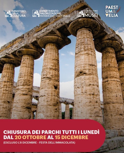 La direzione dei parchi archeologici di Paestum e Velia comunica che dal 20 ottobre al 15 dicembre 2025, ogni lunedì (eccetto l’8 dicembre) il Museo e l’area archeologica di Paestum e l’area archeologica di Velia saranno chiusi al pubblico.