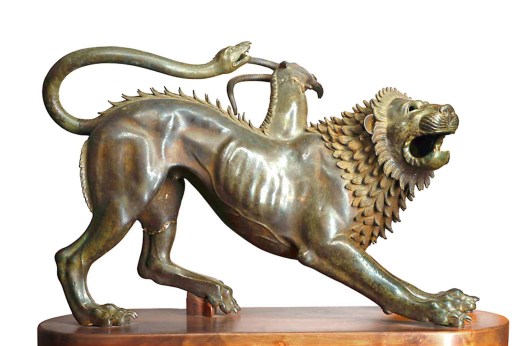 “La Chimera di Arezzo”, spiega il direttore Maras, “è una scultura etrusca di bronzo, capolavoro dell’arte etrusca del 400 a.C. ca, che raffigura un mostro mitologico, la Chimera, una bestia impossibile composta di una testa e un corpo di leone, una testa di capro che spunta dal dorso e una coda di serpente o di drago. Era un mostro che secondo la mitologia infestava le montagne della Licia in Asia Minore e fu sconfitta dall’eroe Bellerofonte.