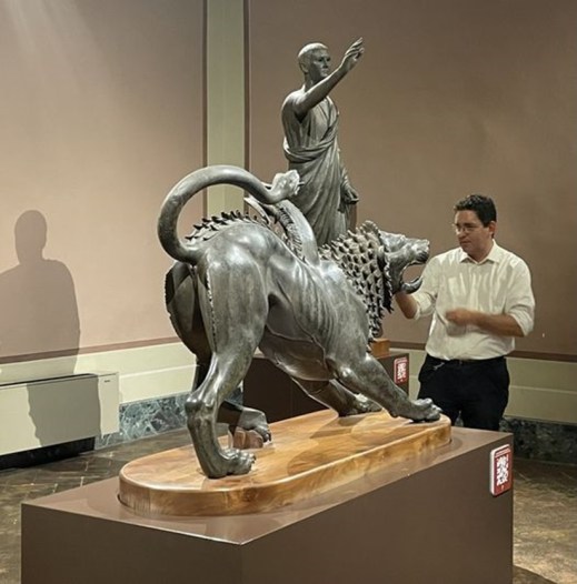 Firenze. Al museo Archeologico nazionale apre la nuova sala della Chimera, simbolo del Maf, primo intervento del più ampio progetto di valorizzazione e riallestimento del museo. Il direttore Maras spiega il mito e il ritrovamento della Chimera, e la restauratrice Basilissi il suo restauro