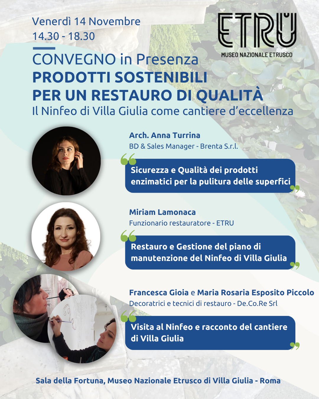 Venerdì 14 novembre 2025, dalle 14.30 alle 18.30, in Sala della Fortuna al museo nazionale Etrusco di Villa Giulia, il convegno “Prodotti Sostenibili per un Restauro di Qualità. Il Ninfeo di Villa Giulia come cantiere d’eccellenza”, che si propone di esplorare i prodotti sostenibili per il restauro, con un focus sul quadro normativo europeo e internazionale; e di presentare i benefici dei prodotti detergenti a base enzimatica per la rimozione selettiva di patine biologiche, attraverso il racconto del Ninfeo di Villa Giulia come cantiere di successo per qualità e impatto ambientale. Partecipazione gratuita in presenza previa iscrizione al link. Il programma. L’arch. Anna Turrina di Brenta S.r.l. introduce alla “Green Conservation” con l’intervento “Sicurezza e Qualità dei prodotti enzimatici per la pulitura delle superfici”; Miriam Lamonaca, funzionario restauratore di ETRU, parla di “ETRU Greener” con l’intervento “Il restauro e la gestione del piano di manutenzione del Ninfeo di Villa Giulia”; chiude la visita guidata al Ninfeo e racconto del cantiere di Villa Giulia a cura di Francesca Gioia e Maria Rosaria Esposito Piccolo, decoratrici e tecnici di restauro di De.Co.Re. Srl.