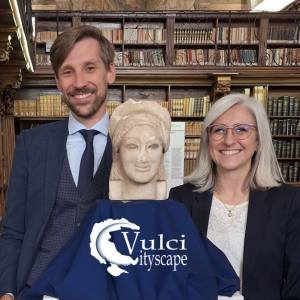 Mariachiara Franceschini dell’università di Friburgo e Paul P. Pasieka dell’università di Magonza (progetto Vulci Cutyscape) con la Kore di Vulci al Mic (foto vulci cityscape)