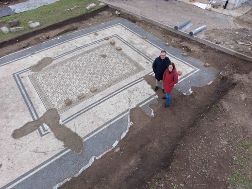 Il direttore Cristiano Tiussi e la funzionaria archeologa Serena Di Tonto sullo scavo del mosaico “tappeto fiorito” nel giardino dell’ex caserma dei carabinieri ad Aquileia (foto calosi / fondazione aquileia)
