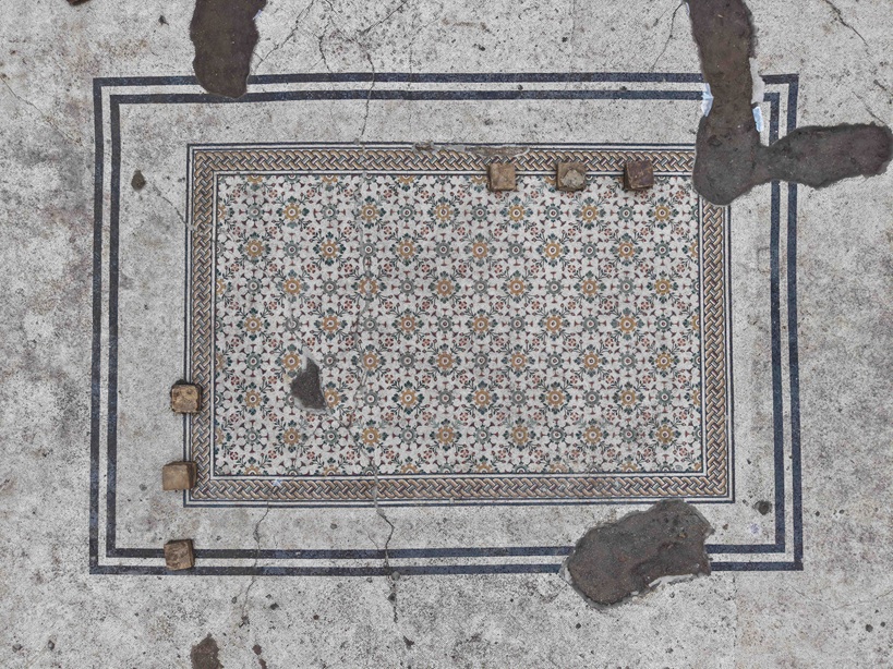Veduta zenitale del mosaico “tappeto fiorito” ri-scoperto dopo sessant’anni nel giardino dell’ex caserma dei carabinieri futuro campus ad Aquileia (foto calosi / fondazione aquileia)