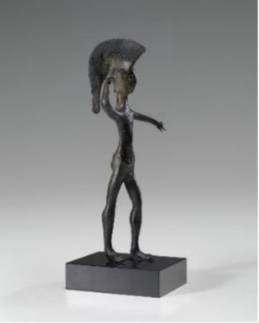 La statuetta schematica rientra nel gruppo dei bronzetti prodotti in ambiente etrusco-italico o più specificamente umbro settentrionale, secondo la definizione e la classificazione elaborate dall’etruscologo Giovanni Colonna già nel corso degli anni ‘60 e ‘70 del ‘900 (G. Colonna, Bron­zi votivi umbro sabellici a figura umana. 1, Periodo arcaico, n.121 p.60, tav. XXX). La diffusione del tipo del guerriero in assalto è fiorente in ambito etrusco, umbro e centro-itali­co; è attestata da produzioni colte cui se ne affiancano di più schematiche e popolari, come nel caso del nostro esemplare, che appartiene ai reperti originariamente parte della Collezione Universitaria, poi confluiti nelle collezioni del museo civico Archeologico. Nei luoghi di culto di una vasta parte dell’Italia pre-romana – conclude Guidi – è frequente l’atto devozionale di offrire alla divinità un oggetto. Progressivamente tale pratica si struttura nell’offerta di precisi oggetti simbolici: rappresentazioni di vittime animali, vasi usati per presentare l’offerta, imma­gini delle parti del corpo risanate (ex voto anatomici), immagini dell’offerente stesso o della divinità venerata. A fronte di una copiosa richiesta di tali beni da donare agli dei, nasce quindi una produzione artigianale finalizzata al culto, spesso localizzata presso i santuari stessi.