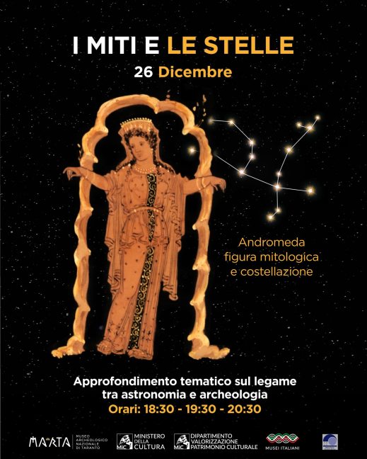 Fin dall’antichità l’uomo ha alzato lo sguardo al cielo, cercando nelle costellazioni un racconto, un ordine, un senso. Le stelle non sono solo luci nel cielo: sono storie antiche di dei, eroi, colpe e redenzioni. Venerdì 26 dicembre 2025 il museo Archeologico nazionale di Taranto propone “I miti e le stelle”, un percorso di valorizzazione gratuito che intreccia astronomia e archeologia: un viaggio tra cielo, mito e collezioni del museo. Il pubblico potrà partecipare alle 18.30, 19.30, 20.30, a sessioni di osservazione e spiegazione delle costellazioni autunnali e invernali, curate dal prof. Paolo Battista, all’interno del planetario e nel chiostro, anche con l’ausilio di un telescopio. L’evento si svolgerà regolarmente anche in caso di condizioni meteo avverse. La prenotazione obbligatoria dovrà essere effettuata al numero 099 4532112 sino ad esaurimento dei posti disponibili, comunicando il proprio nome e cognome, email, telefono e numero di partecipanti. A seguire, con l’acquisto del biglietto, sono previsti approfondimenti sui reperti del museo legati ai personaggi mitologici delle costellazioni osservate, creando un dialogo suggestivo tra astronomia, mito e archeologia. Durante la serata verranno raccontati, tra gli altri, i miti di Andromeda, Perseo, Cassiopea, Orione e i Dioscuri, per scoprire come gli antichi Greci abbiano proiettato nel firmamento storie di potere, amore, hybris e punizione divina.