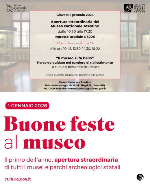 Capodanno al museo nazionale Atestino di Este (Pd). Il 1° gennaio 2026 il museo sarà straordinariamente aperto dalle 10.30 alle 17.30, con un biglietto speciale a 1 euro. Alle 10.45, 12.30, 14.30 e 16, “Il museo si fa bello”, percorso guidato al cantiere di riallestimento a cura del personale del museo, incluso nel prezzo del biglietto.