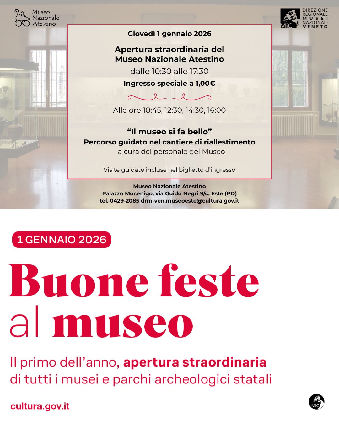 Capodanno al museo nazionale Atestino di Este (Pd). Il 1° gennaio 2026 il museo sarà straordinariamente aperto dalle 10.30 alle 17.30, con un biglietto speciale a 1 euro. Alle 10.45, 12.30, 14.30 e 16, “Il museo si fa bello”, percorso guidato al cantiere di riallestimento a cura del personale del museo, incluso nel prezzo del biglietto.