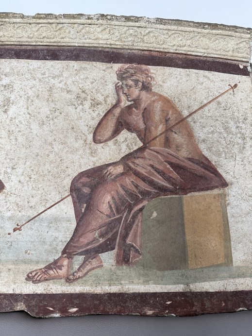 Dettaglio di Anfitrione dell’affresco con Ercole bambino strappato illecitamente dal sacello di Civita Giuliana e restituito dagli USA al parco archeologico di Pompei (foto parco archeologico pompei)