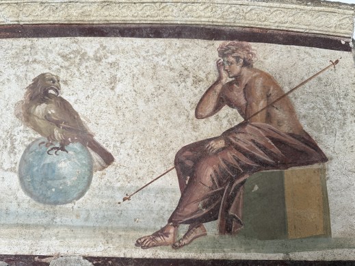 Dettaglio di Zeus (aquila) e Anfitrione dell’affresco con Ercole bambino strappato illecitamente dal sacello di Civita Giuliana e restituito dagli USA al parco archeologico di Pompei (foto parco archeologico pompei)