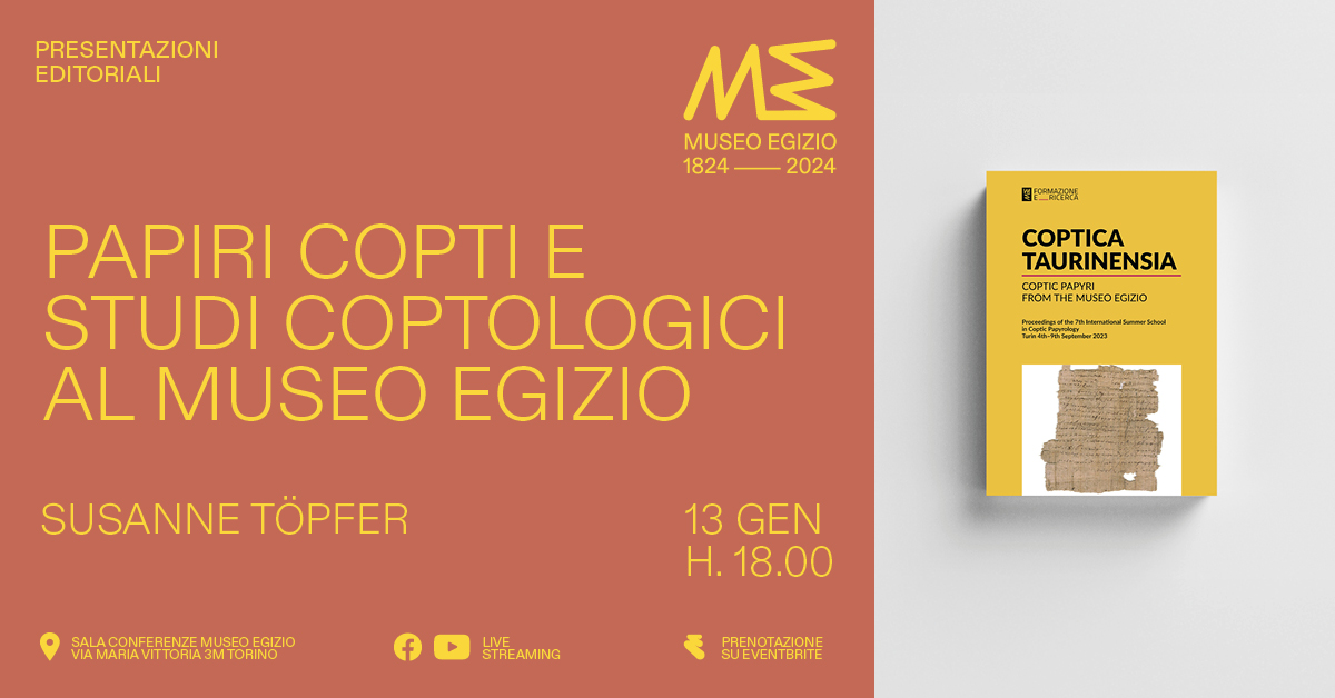 Martedì 13 gennaio 2026, alle 18, in sala Conferenze del museo Egizio di Torino, con ingresso da via Maria Vittoria 3M, conferenza “Papiri copti e studi coptologici al museo Egizio” con Susanne Töpfer per un approfondimento sui papiri copti del museo Egizio. L’ingresso è libero con prenotazione obbligatoria al link https://www.eventbrite.it/e/i-papiri-copti-del-museo-egizio-studi-ricerche-e-nuove-scoperte-tickets-1978961979553?aff=ebdsoporgprofile&_gl=1*tzm61n*_up*MQ..*_ga*MTM4ODAwMDM1My4xNzY3NzgwMDU2*_ga_TQVES5V6SH*czE3Njc3ODAwNTUkbzEkZzAkdDE3Njc3ODAwNTUkajYwJGwwJGgw. L’evento è disponibile anche in streaming sulla nostra pagina Facebook e sul nostro canale YouTube. L’intervento presenta il valore e la ricchezza dei papiri copti del museo Egizio, luogo che conserva una delle più vaste e significative collezioni di testi copti al mondo. A partire dal libro Coptica Taurinensia, verranno illustrati i principali risultati della 7a International Summer School in Coptic Papyrology, tra cui nuove edizioni di testi documentari, liturgici e agiografici. La conferenza offrirà inoltre una panoramica complessiva della collezione copta del Museo – dai nuclei storici provenienti dagli acquisti Drovetti ai frammenti recentemente studiati – mettendo in luce il loro contributo alla ricostruzione della storia sociale, religiosa e linguistica dell’Egitto tardoantico e primo periodo islamico. Verrà infine evidenziato il ruolo del Museo Egizio come centro di ricerca attivo e innovativo negli studi coptologici.
