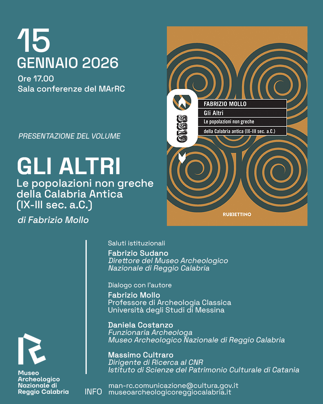 Giovedì 15 gennaio 2026, alle 17, al museo Archeologico nazionale di Reggio Calabria, nella sala conferenze del MArRC, presentazione del libro “Gli Altri. Le popolazioni non greche della Calabria antica (IX–III sec. a.C.)” di Fabrizio Mollo. All’incontro partecipano il direttore del museo Archeologico nazionale di Reggio Calabria Fabrizio Sudano, l’autore Fabrizio Mollo (università di Messina), Daniela Costanzo (MArRC) e Massimo Cultraro (Ispc-Cnr). Per informazioni: mar-rc.comunicazione@cultura.gov.it. Il libro affronta il complesso sistema di relazioni tra Greci e popolazioni indigene e italiche nella Calabria antica, mettendo al centro gli “Altri”: comunità spesso marginalizzate dalla narrazione storica tradizionale. Attraverso fonti letterarie, origini mitiche e documentazione archeologica, il volume ricostruisce un quadro articolato che va dalla colonizzazione greca alla crisi delle poleis, dalla fine di Sibari all’arrivo di Lucani e Brettii, fino alla guerra annibalica e all’affermazione di Roma.