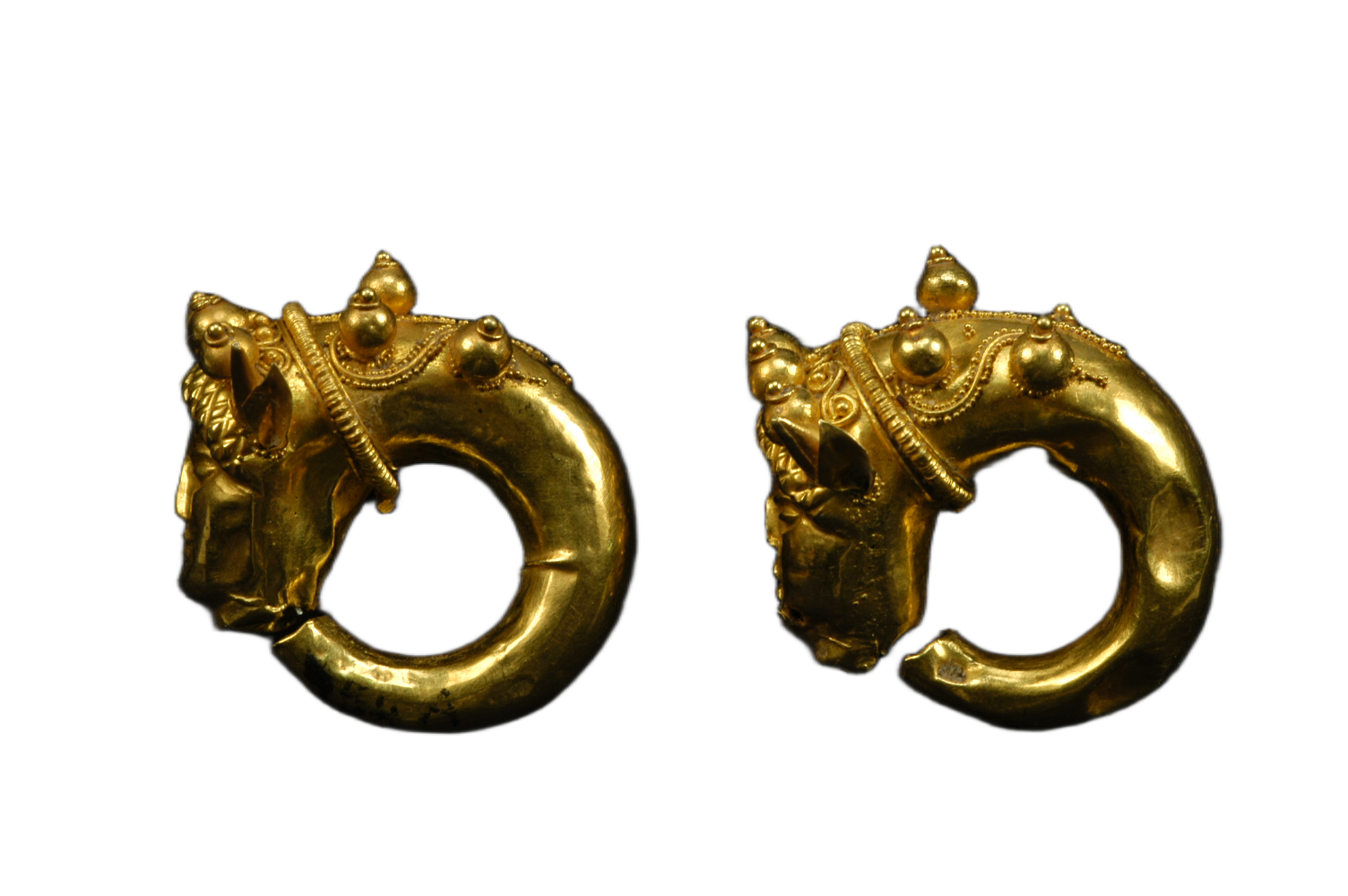 Coppia di orecchini in oro con testa di Acheloo dalla Tomba 148A, conservati nel museo Archeologico nazionale di Ferrara (foto drm-em-rom)