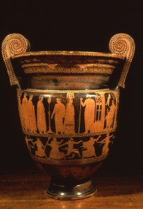 Cratere a volute attico a figure rosse, Pittore di Kleophon Lato A: processione ad Apollo delfico, dalla Tomba 57C, conservato al museo Archeologico nazionale di Ferrara (foto drm-em-rom)