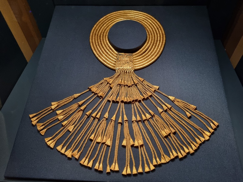 La mostra “Tesori dei faraoni” presenta oltre quaranta preziosissimi manufatti in oro, tra cui il celebre collare di Psusennes I. Questa straordinaria creazione è composta da sette fili di oltre 6.000 dischetti d’oro ed è considerata il gioiello più pesante dell’antichità giunto fino a noi.