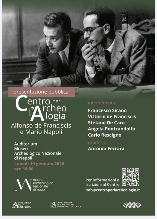 Lunedì 19 gennaio 2026, alle 16, all’Auditorium del museo Archeologico nazionale di Napoli, presentazione pubblica del “Centro per l’Archeologia Alfonso De Franciscis e Mario Napoli”, un nuovo spazio – con sede a Palazzo De Franciscis a Caserta – dedicato alla memoria e all’eredità di due grandi figure dell’archeologia italiana, con l’obiettivo di promuovere la formazione di giovani archeologi, europei e internazionali, favorendo l’adozione di tecniche avanzate e approcci multidisciplinari. Inoltre, si propone di valorizzare e tutelare le realtà archeologiche meno conosciute nel territorio campano e oltre, rafforzando i legami tra arte, storia e società, in linea con la visione dei due maestri. Alfonso de Franciscis e Mario Napoli, compagni di studi e stimati colleghi, sono stati due pilastri dell’archeologia nel secondo dopoguerra. La loro attività ha segnato un punto di svolta nel modo di approcciare lo studio, lo scavo e la conservazione dei reperti archeologici, distinguendosi per rigore metodologico e visione innovativa. Entrambi hanno formato generazioni di giovani studiosi, lasciando un’eredità che oggi il nuovo Centro intende perpetuare e rinnovare.