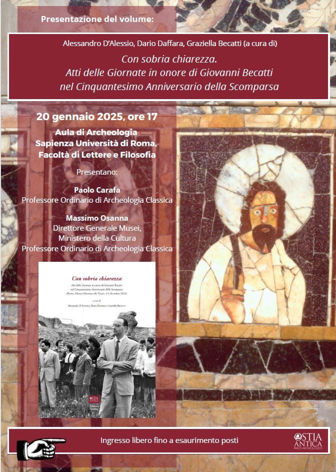 Martedì 20 gennaio 2026, alle 17, all’Aula di Archeologia di Sapienza Università di Roma – Facoltà di lettere e archeologia, presentazione del libro “Con sobria chiarezza. Atti delle Giornate in onore di Giovanni Becatti nel Cinquantesimo Anniversario della Scomparsa”, a cura di Alessandro D’Alessio, Dario Daffara e Graziella Becatti. Presenteranno il volume il prof. Paolo Carafa e il direttore generale Musei Massimo Osanna. Non è richiesta prenotazione, ingresso libero fino a esaurimento dei posti disponibili. Grazie al contributo di allievi, colleghi e continuatori della sua opera nell’ufficio degli Scavi di Ostia, il convegno è stato l’occasione per ripercorrere la carriera di uno studioso che ha lasciato un’impronta profonda nella storia dell’arte antica e nell’archeologia del XX secolo (vedi Roma. A Palazzo Massimo “Con sobria chiarezza”, due giornate di studio in onore di Giovanni Becatti a cinquant’anni dalla scomparsa: in presenza e on line. Il programma | archeologiavocidalpassato).