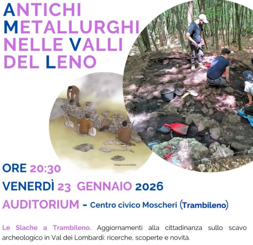 - Trambileno (Tn). All’auditorium l’incontro “Le Slache a Trambileno” con i primi risultati degli scavi archeologici condotti in località Val dei Lombardi nell’ambito del progetto “Antichi metallurghi delle Valli del Leno”: tra le scoperte un forno fusorio dell’età del Bronzo gennaio 23, 2026