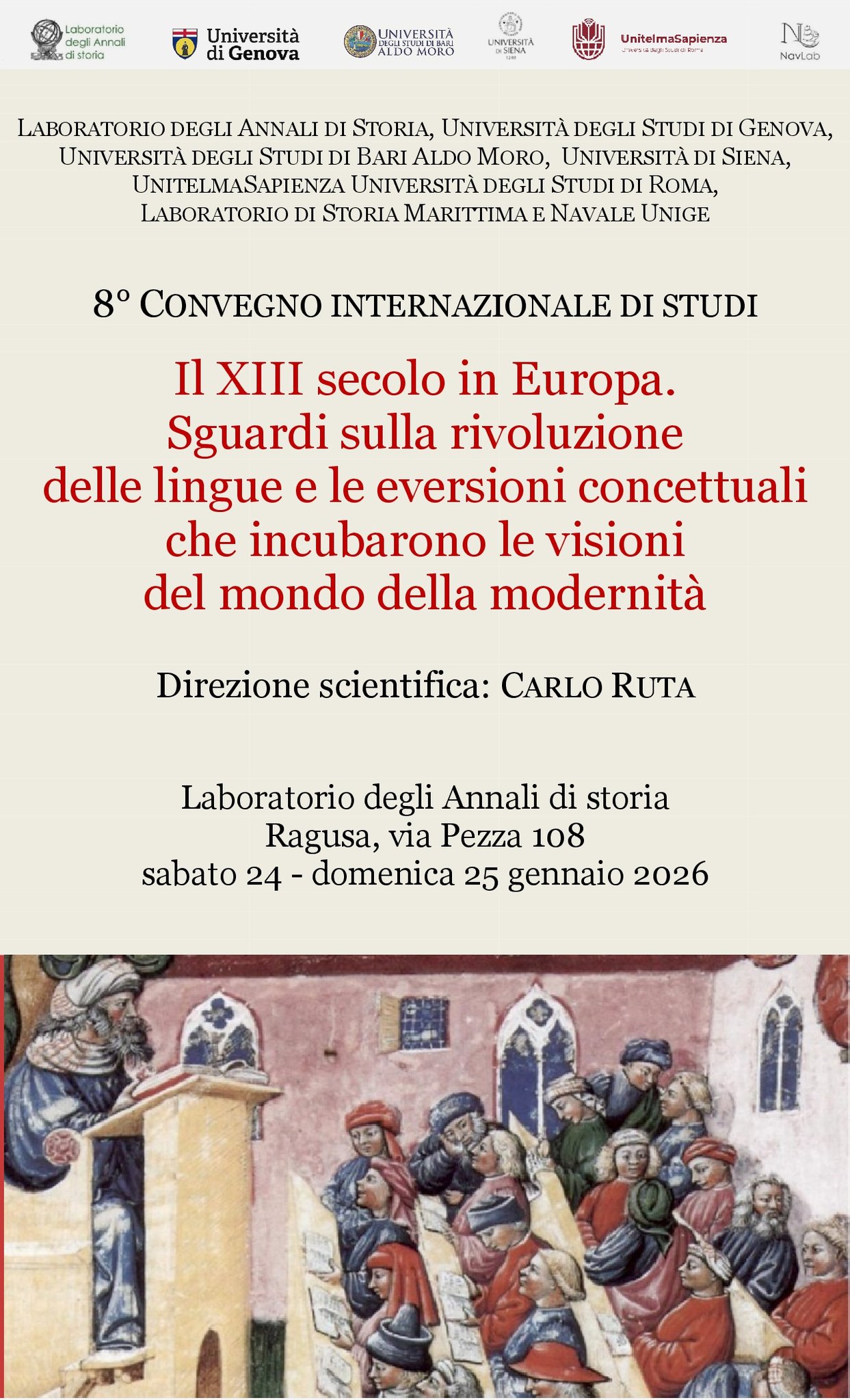 Programma. Il convegno apre, alle 14.30, con l’intervento di Carlo Ruta su “Il XIII secolo in Europa: sguardo sulla rivoluzione delle lingue, dal sedimento popolare all’esperimento dotto, alle confluenze nazionali. Indagine sulle eversioni concettuali che incubarono le visioni del mondo della modernità”. Seguono i contributi tematici. La storica Sandra Origone su “Il notaio, professionista della penna, e l’incontro con realtà diverse”; la studiosa delle letterature Giuseppa Tamburello su “Un XIII secolo cinese con le sue implicazioni linguistiche e letterarie”; l’epistemologo Giuseppe Varnier su “Dante: un poeta-filosofo e la rinascita della filosofia alla fine del XIII secolo”; il ricercatore medievista Marco Leonardi su “Il primo confronto con i Novissima tempora della storia. Come le cronache domenicane del tardo XIII secolo hanno presentato un nuovo laboratorio di studio e di analisi della realtà circostante”; la storica dell’arte Maristella Trombetta su “La lirica d’arte e le culture materiali del Mezzogiorno nel Regnum di Federico II”; lo storico Emiliano Beri su “Le lingue e le forme lessicali delle marinerie liguri nei commerci con i paesi d’Oltremare e nella cantieristica navale agli albori dell’età moderna”; il paletnologo Alberto Cazzella su “Rapporto tra linguistica e archeologia in relazione al problema dell’Indoeuropeo”; lo storico Antonello Folco Biagini su “Lingue dominanti e lingue minori nei processi multiculturali tra età moderna e contemporanea”; il geografo Nunzio Famoso su “Evoluzione e letteratura gaelica alla svolta del XIII secolo, L’impatto del colonialismo inglese”; la sinologa Pamela Kyle Crossley su “Le diramazioni linguistiche dei mondi euroasiatici lungo l’età premoderna”. In margine al convegno, domenica 25 gennaio 2026, dalle 10.30 alle 13, tavola rotonda “Riflessioni sui lavori e contributi aggiuntivi per un ampliamento del dibattito” con Nunzio Famoso, Sandra Origone, Carlo Ruta, Maristella Trombetta, Giuseppe Varnier. Infine il direttore scientifico annuncerà l’argomento e la data del 9° Convegno internazionale.