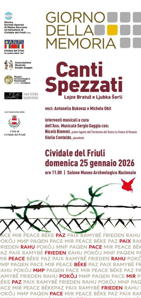 Domenica 25 gennaio 2026, Giorno della memoria, al museo Archeologico nazionale di Cividale (Ud), alle 11, “Canti spezzati”, iniziativa realizzata in collaborazione con Storica Somsi di Cividale aps, associazione musicale Sergio Gaggia, ANPI – Associazione Nazionale Partigiani Italia, Sezione di Cividale, circolo culturale KD Ivan Trinko, con il patrocinio del Comune di Cividale del Friuli. In programma la storia del compositore, organista e maestro di cappella sloveno Lojze Bratuz, italianizzato in Luigi Bertossi, vittima del regime fascista, raccontata dalle parole della moglie Ljubka Šorli, poetessa, scrittrice e insegnante, con le voci di Antonella Bukovaz e Michele Obit. Interventi musicali a cura dell’Associazione Sergio Gaggia con Nicolò Biemmi, primo fagotto del teatro la Fenice; Giulia Contaldo, pianoforte.