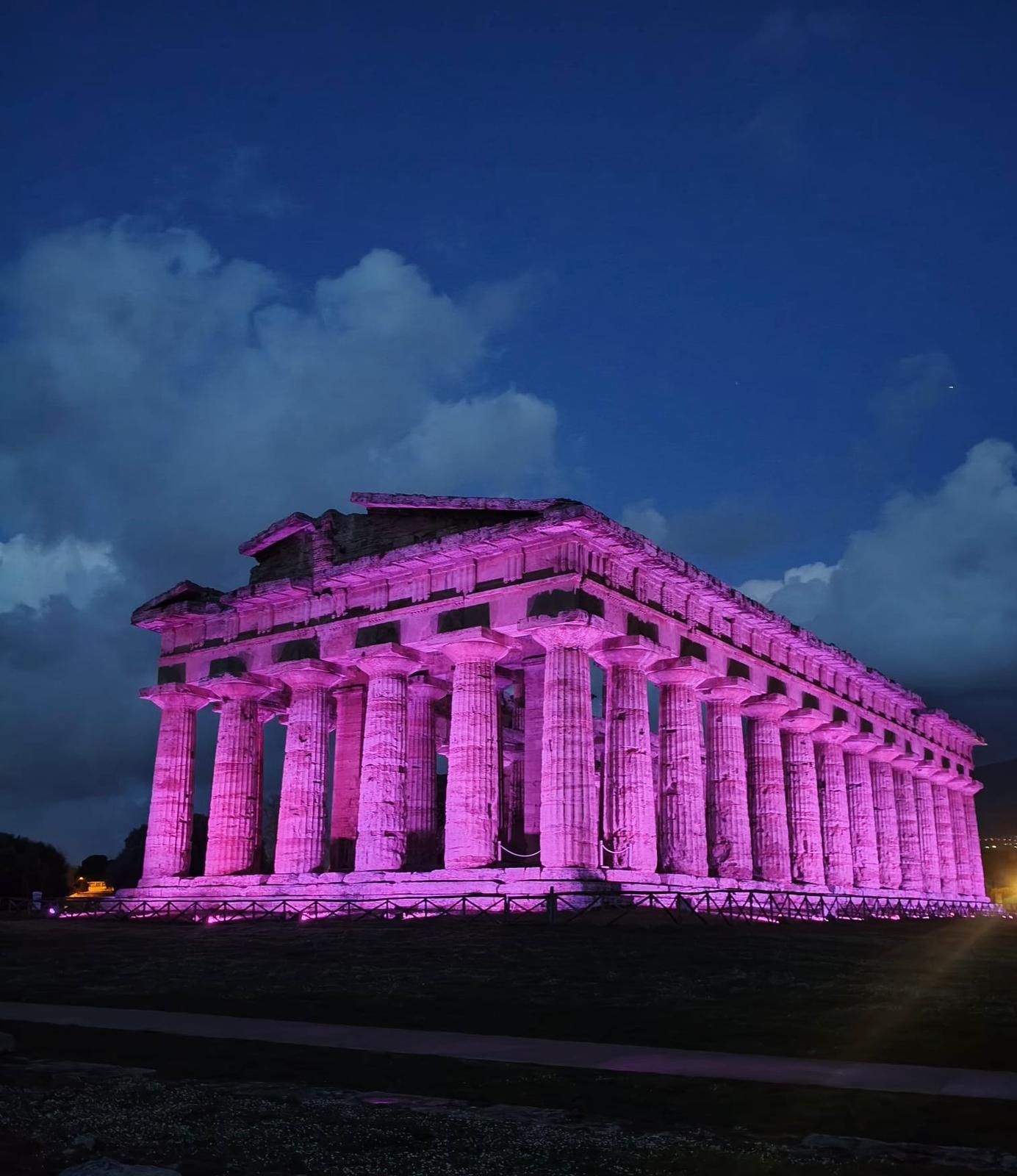 Paestum (Sa). A 100 giorni dalla partenza del 109° Giro d’Italia il Tempio di Nettuno si è “vestito” di rosa per una notte