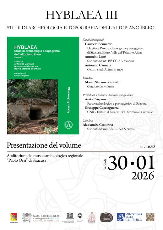Venerdì 30 gennaio 2026, alle 16.30, all’Auditorium del museo Archeologico regionale “Paolo Orsi” di Siracusa, presentazione del libro “HYBLAEA III. Studi di archeologia e topografia dell’altopiano ibleo”, terzo tomo della collana dedicata allo studio del territorio ibleo. Il volume, curato da esperti del settore come Antonio Canale, Antonino La Torre e Marco Stefano Scavelli, si propone di approfondire la conoscenza del territorio ibleo attraverso ricerche di alta qualità. A conferire ulteriore prestigio all’opera è la prefazione di Robert Leighton, un’autorità nel campo della archeologia. Dopo i saluti istituzionali di Carmelo Bennardo, direttore del parco archeologico e paesaggistico di Siracusa Eloro Villa del Tellaro e Akrai; di Antonino La Torre, soprintendente BB.CC.AA. Siracusa; e di Antonino Cannata, Centro Studi Iblei, introduce l’incontro Marco Stefano Scavelli, curatore del libro. La presentazione del libro e il dialogo con gli autori saranno affidati ad Anita Crispino, parco archeologico e paesaggistico di Siracusa; e a Giuseppe Cacciaguerra, CNR – Istituto di Scienze del Patrimonio Culturale. Le conclusioni saranno a cura di Alessandra Cacciatore, soprintendenza BB.CC.AA. Siracusa. Dunque un appuntamento dedicato alla ricerca archeologica e alla conoscenza del paesaggio storico dell’altopiano ibleo, attraverso un nuovo contributo scientifico della collana HYBLAEA.