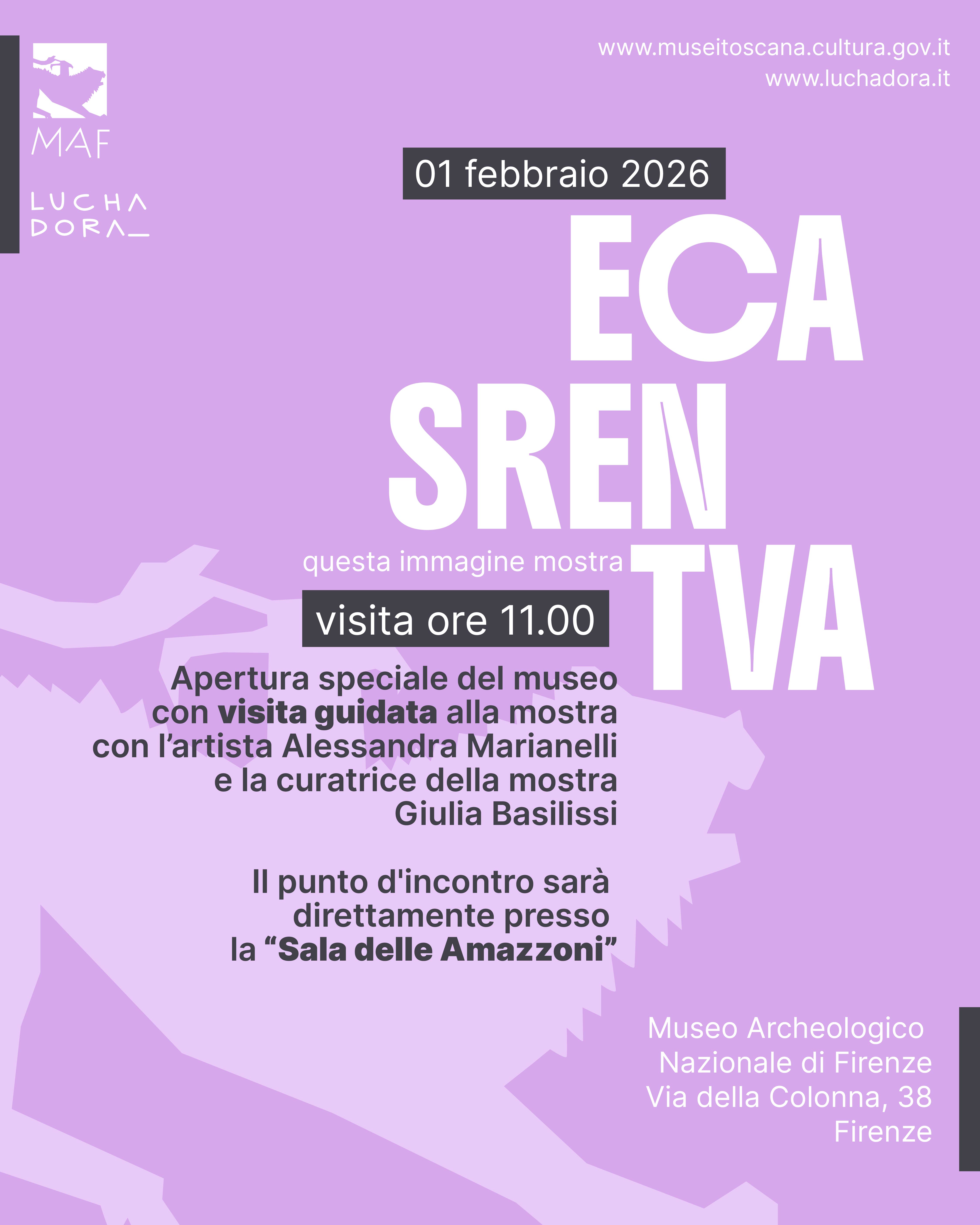 Domenica 1° febbraio 2026, durante la giornata di apertura gratuita del museo Archeologico nazionale di Firenze alle 11 ci sarà una visita guidata alla mostra “ECA SREN TVA” con l’artista Alessandra Marianelli e la curatrice della mostra Giulia Basilissi. Il punto di incontro sarà la “Sala del sarcofago delle Amazzoni”. “Questo straordinario sarcofago etrusco in marmo dipinto, databile intorno alla metà del IV secolo a.C., apparteneva all’aristocratica matrona tarquiniese Ramtha Huzcnai”, ha illustrato il direttore Daniele F. Maras in occasione dell’inaugurazione della mostra. “Alle due estremità del coperchio a forma di tetto è rappresentato a rilievo Atteone sbranato dai cani; invece la cassa è decorata a tempera con un dinamico fregio a colori raffigurante la lotta tra Amazzoni e Greci. A differenza dall’arte greca, in cui le Amazzoni (descritte nel mito come un popolo di invincibili donne guerriere) sono sempre rappresentate al momento della sconfitta da parte di Eracle, Achille o Teseo, l’artista del sarcofago etrusco ha scelto di mostrare una lotta alla pari tra contendenti uomini e donne, che culmina sulla fronte della cassa con le quadrighe di due regine amazzoni che travolgono i guerrieri greci appiedati. Sembra evidente che il sarcofago, dedicato a una donna da suo nipote, il magistrato tarquiniese Laris Apaiatrus, fosse una celebrazione della combattività femminile: qualcosa che solo la società etrusca poteva accettare, una società in cui alle donne erano riconosciuti diritti come soggetti giuridici attivi”. E l’artista Alessandra Marianelli, in arte Luchadora: “queste parole del direttore del museo mi colpirono tantissimo, soprattutto la frase Oggi abbiamo vinto noi in riferimento alle Amazzoni e per questo ho voluto rappresentare una Amazzone vincente”.