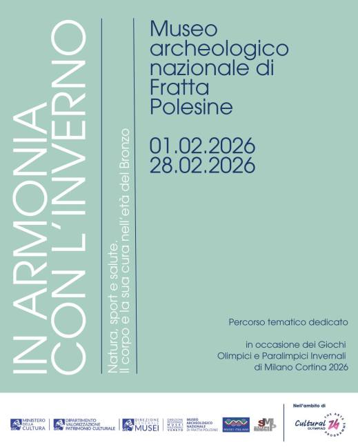 In armonia con l’inverno: natura, sport e salute. Il corpo e la sua cura nell’età del Bronzo: percorso tematico al museo Archeologico nazionale di Fratta Polesine dal 1° al 28 febbraio 2026. L’evento, inoltre, inaugura il percorso tematico dedicato alla cura del corpo nell’età del Bronzo, proposto dal museo in occasione dei Giochi Olimpici e Paralimpici Invernali di Milano Cortina 2026 e incluso nel programma dell’Olimpiade Culturale della Fondazione Milano Cortina 2026. Gli oggetti esposti raccontano le pratiche di cura del corpo nelle comunità dell’età del Bronzo finale che abitavano l’area dell’antico fiume Po. Gesti quotidiani apparentemente semplici, carichi invece di significati simbolici e sociali, che trovano sorprendenti punti di contatto con i valori dello sport contemporaneo e con l’attenzione al corpo propria del mondo olimpico e paralimpico. Il percorso tematico propone una rilettura di oggetti legati alla cura del corpo, selezionati sia dal percorso espositivo permanente sia dai depositi del Museo. Strumenti per la toilette, ornamenti personali e oggetti connessi alla sfera del benessere fisico raccontano gesti quotidiani che, oltre alla funzione pratica, rivestivano un forte valore simbolico, identitario e sociale. Attraverso i reperti selezionati, il visitatore sarà invitato a riflettere sul significato della cura del corpo nelle comunità dell’età del Bronzo: un insieme di pratiche legate all’igiene, all’aspetto esteriore, allo status e alle relazioni sociali, che trovano un inaspettato punto di contatto con i temi Olimpici contemporanei, dove il corpo è al centro di disciplina, preparazione e rappresentazione. Il percorso tematico offre così una narrazione nuova e mirata, capace di valorizzare una piccola selezione di reperti, inserendoli in un dialogo più ampio che unisce archeologia, storia culturale e attualità, nel segno delle Olimpiadi e Paralimpiadi Invernali di Milano Cortina 2026.