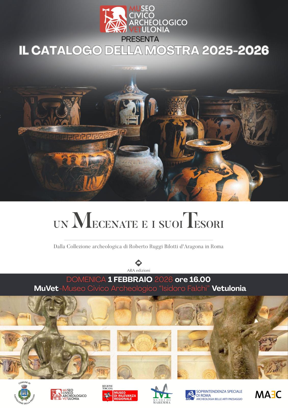 In occasione del secondo appuntamento della Festa dei Musei di Maremma, domenica 1° febbraio 2026, al museo civico Archeologico “Isidoro Falchi” di Vetulonia (Castiglione della Pescaia, Gr), alle 16, presentazione del catalogo della mostra “UN MECENATE E I SUOI TESORI. La Collezione archeologica di Roberto Bilotti Ruggi d’Aragona in Roma”, con la quale il MuVet ha celebrato i 25 anni dalla sua nascita. Il libro è frutto di un lungo e importante lavoro portato avanti da un gruppo internazionale di studiosi che, per la prima volta, permette al grande pubblico di conoscere un insieme di opere di straordinaria rilevanza per la storia del collezionismo archeologico in Italia, a partire da opere di arte antica fino all’arte moderna. Alla presentazione Intervengono Elena Nappi, sindaco di Castiglione della Pescaia; Simona Rafanelli, direttrice scientifica MuVet; Vincent Jolivet, CNRS-Parigi; Alessandro Bartoletti e Filippo Guidarelli, ARA edizioni. Apertura straordinaria del museo fino alle 18. Ingresso libero fino ad esaurimento posti. Brindisi offerto da Tenuta Fertuna. Info e contatti: 0564 927245; museo.vetulonia@comune.castiglionedellapescaia.gr.it.