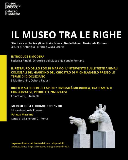 Con l’incontro di mercoledì 4 febbraio 2026 riprende il ciclo 2025-2026 di conferenze “Il Museo tra le righe. Studi e ricerche tra gli archivi e le raccolte del museo nazionale Romano” a cura di Giulia Cirenei e Antonella Ferraro, con i suoi appuntamenti al museo nazionale Romano. Appuntamento alle 17, nella sala conferenze di Palazzo Massimo per un incontro dedicato ad alcuni interventi conservativi realizzati sotto la direzione del Servizio Restauro del museo nazionale Romano. Introduce e modera Federica Rinaldi, direttrice del museo nazionale Romano. Intervengono Silvia Borghini, Debora Fagiani su “Il restauro dello zoo di marmo. l’intervento sulle teste animali colossali del giardino del chiostro di Michelangelo presso le Terme di Diocleziano”; e Chiara Alisi, Rita Reale su “Biofilm su superfici lapidee: diversità microbica, trattamenti conservativi, prodotti innovativi”. Nel corso del 2023 le sette teste colossali di animali, esposte nel Chiostro di Michelangelo, sono state protagoniste di un intervento di restauro che ha saputo mettere a punto un’innovativa “strategia eco-sostenibile” attraverso l’uso di tecniche e prodotti bio-compatibili. Di questo intervento, progettato dal Servizio Restauro del museo nazionale Romano, e di altre tecnologie sperimentali in atto, si parlerà proprio nell’incontro di mercoledì 4 febbraio 2026. Ingresso libero nel limite dei posti disponibili. Prenotazione obbligatoria: ilmuseotralerighe.eventbrite.it.