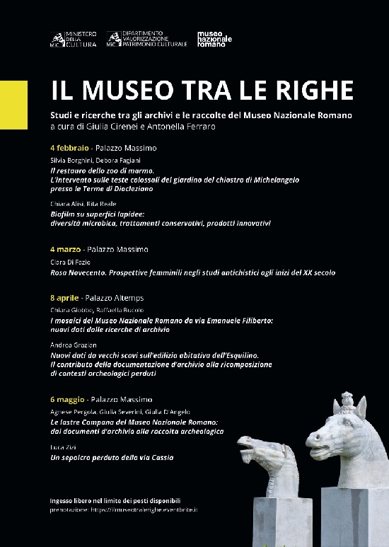 IL PROGRAMMA FINO A MAGGIO 2026. 4 marzo 2026, alle 17, a Palazzo Massimo: Clara Di Fazio, “Rosa Novecento. Prospettive femminili negli studi antichistici agli inizi del XX secolo”; 8 aprile 2026, alle 17, Palazzo Altemps: Chiara Giobbe, Raffaella Bucolo, “I mosaici del Museo Nazionale Romano da via Emanuele Filiberto: nuovi dati dalle ricerche di archivio”; Andrea Grazian, “Nuovi dati da vecchi scavi sull’edilizia abitativa dell’Esquilino. Il contributo della documentazione d’archivio alla ricomposizione di contesti archeologici perduti”; 6 maggio 2026, alle 17, a Palazzo Massimo: Agnese Pergola, Giulia Severini, Giulia D’Angelo, “Le lastre Campana del Museo Nazionale Romano: dai documenti d’archivio alla raccolta archeologica”; Luca Zizi, “Un sepolcro perduto della via Cassia”. Prenotazione per ogni appuntamento: ilmuseotralerighe.eventbrite.it.