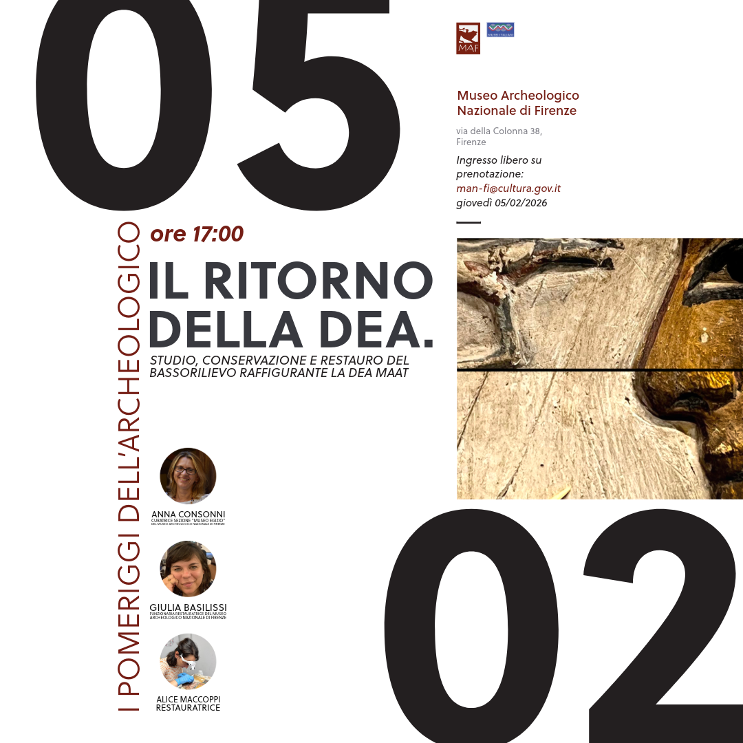 Al museo Archeologico nazionale di Firenze per i “Pomeriggi dell’Archeologico” giovedì 5 febbraio 2026, alle 17, la conferenza “Il ritorno della dea. Studio, conservazione e restauro del bassorilievo raffigurante la dea Maat” con Giulia Basilissi, funzionaria restauratrice del museo Archeologico nazionale di Firenze; Anna Consonni, curatrice sezione “Museo Egizio” del museo Archeologico nazionale di Firenze; Alice Maccoppi, restauratrice. Prenotazione obbligatoria scrivendo a: man-fi@cultura.gov.it. Il celebre bassorilievo raffigurante la dea egizia Maat, simbolo di verità, giustizia e ordine cosmico, conservato presso il Museo Archeologico Nazionale di Firenze e proveniente dalla tomba del faraone Seti I, rappresenta uno dei capolavori più significativi della collezione fiorentina. Il recente intervento di restauro, avviato in occasione dell’esposizione nella mostra Divine Egypt al Metropolitan Museum of Art di New York appena conclusasi, ha costituito un’importante occasione di studio, permettendo di ripercorrere la storia conservativa dell’opera e di approfondire le tecniche esecutive degli artigiani dell’antico Egitto. Durante l’incontro si offrirà l’inquadramento storico e collezionistico del bassorilievo, soffermandosi sulle modalità del suo arrivo a Firenze, e verranno illustrati alcuni dei risultati delle indagini diagnostiche non invasive condotte dal CNR-IFAC di Firenze. Queste analisi sono state fondamentali per valutare lo stato di conservazione, orientare le scelte di restauro e acquisire nuove informazioni materiali e tecniche, utili sia alla ricerca scientifica sia alla valorizzazione e divulgazione museale, per restituire al pubblico una lettura rinnovata di questo straordinario manufatto.