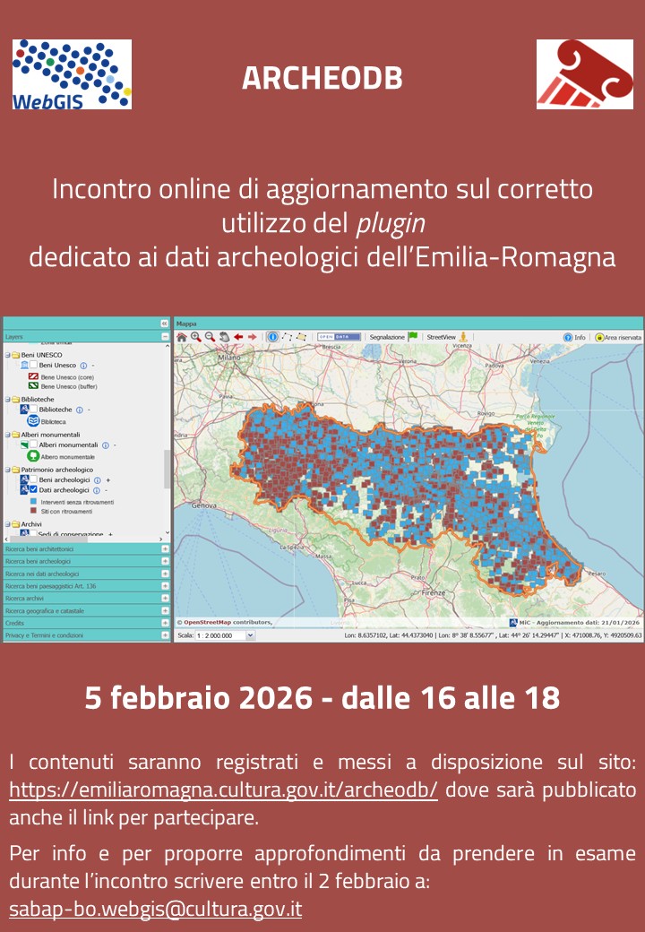 Le soprintendenze ABAP dell’Emilia-Romagna organizzano l’incontro online di aggiornamento “Il corretto utilizzo del plugin dedicato ai dati archeologici dell’Emilia-Romagna”, giovedì 5 febbraio 2026, alle 16. Incontro in diretta streaming. Il link per accedere alla diretta, i contenuti on demand e ulteriori info sono disponibili all’indirizzo: https://emiliaromagna.cultura.gov.it/archeodb/. Incontro di aggiornamento sul corretto utilizzo del plugin ArcheoDB, il Geodatabase dei siti oggetto di interventi e/o ritrovamenti archeologici, pienamente interoperabile con il Geoportale Nazionale per l’Archeologia (GNA), adottato come strumento obbligatorio per la raccolta sistematica dei dati archeologici sul territorio regionale. Saranno presi in esame alcuni dei problemi segnalati dagli utenti e/o dai funzionari preposti al controllo della documentazione: il corso è quindi aperto a tutti, ma rivolto in particolare a gli archeologi già in possesso delle conoscenze di base dell’utilizzo del plugin.