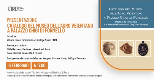 Venerdì 6 febbraio 2026, alle 17, al museo nazionale Etrusco di Villa Giulia presentazione del “Catalogo del museo dell’Agro Veientano a Palazzo Chigi di Formello. Museo di territorio da Wunderkammer a Clef des Songes I-II”, Formello 2024. Introduce Vittoria Lecce, funzionario archeologo museo ETRU. Presentano i volumi Gilda Bartoloni, Sapienza Università di Roma; Paolo Liverani, università di Firenze. Sarà presente la curatrice Iefke van Kampen, direttore del museo dell’Agro Veientano. Ingresso gratuito in sala Fortuna fino ad esaurimento posti. Prenotazione consigliata all’indirizzo mail: mn-etru.comunicazione@cultura.gov.it