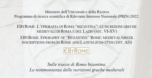 PROGRAMMA. Salle 10, Saluti istituzionali: Luana TONIOLO (direttrice del parco archeologico dell’Appia Antica, delegata del direttore generale Musei Massimo Osanna); 10.30, Francesco D’AIUTO – Andrea LUZZI, “Un progetto di ricerca sull’epigrafia bizantina di Roma, e il centenario della Rivista di studi bizantini e neoellenici”; 10.50, Francesca POTENZA, “Parole scolpite, incise, dipinte: la varietà delle iscrizioni greche medievali dell’Urbe”; 11.10, Maria Francesca SGANDURRA, “Lost and found: le sillogi manoscritte come ponte tra perdita materiale e conservazione della memoria epigrafica”; 11.30, Paolo DE ROSSI – Alessandra GIULIANO, “Il greco nelle iscrizioni quattrocentesche: un aspetto insondato dell’Umanesimo romano”; 11.50, Discussione.