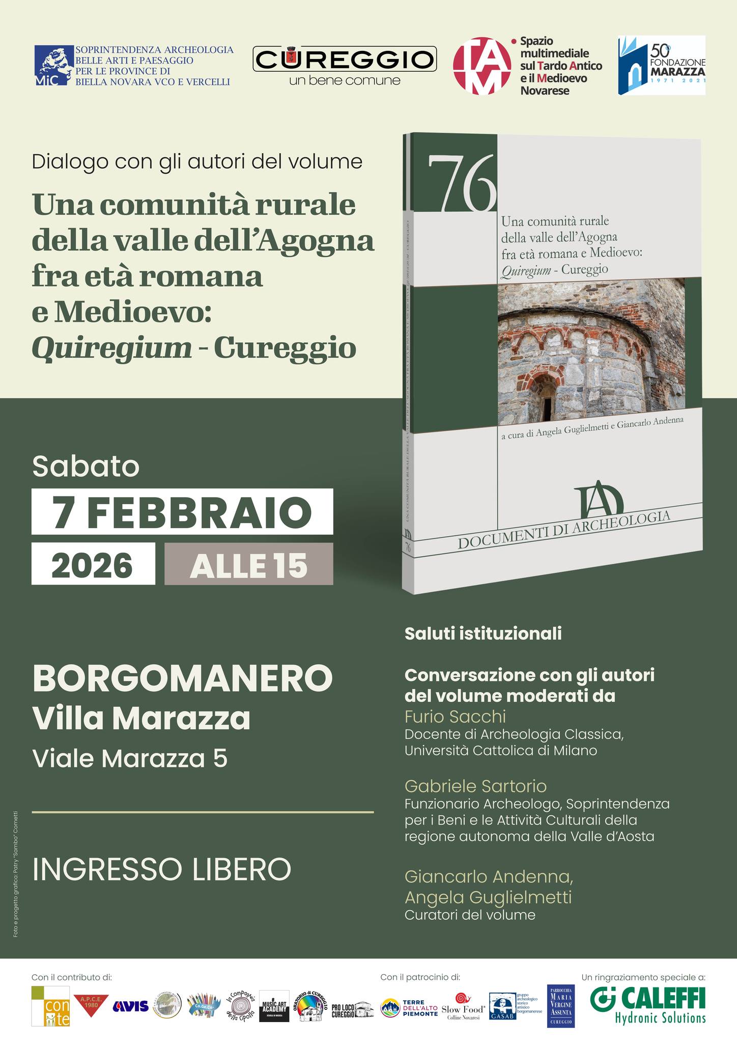 Il 7 febbraio 2026, alle 15, a Villa Marazza di Borgomanero (No) presentazione del libro “Una comunità rurale della valle dell’Agogna fra età romana e medioevo: Quiregium-Cureggio” a cura Angela Guglielmetti e Giancarlo Andenna (Sap Libri). Gli autori in dialogo con Furio Sacchi (università Cattolica di Milano) e Gabriele Sartorio (soprintendenza per i Beni e le Attività culturali della Valle d’Aosta).