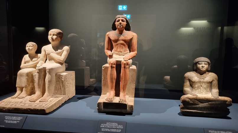 In una seconda vetrina la statua di Nimaatsed investe di scriba in granito grigio dipinto (V dinastia, Antico Regno), dalla Tomba di Nimaatsed a Saqqara: è uno dei capolavori della scultura non regale della V dinastia. Al centro la statua di Inty-Shedu “sovrintendente alla barca della dea Neith” in pietra calcarea dipinta, dal cimitero superiore della necropoli dei Costruttori di Piramidi a Sud-Est della Sfinge a Giza, scoperta da Zahi Hawass nel 1992. Chiude la statua di Ibes e della moglie Henutsen in pieta calcarea dipinta (V dinastia, Antico Regno), dalla necropoli di Giza, scoperta dall’università del Cairo nel 1973.