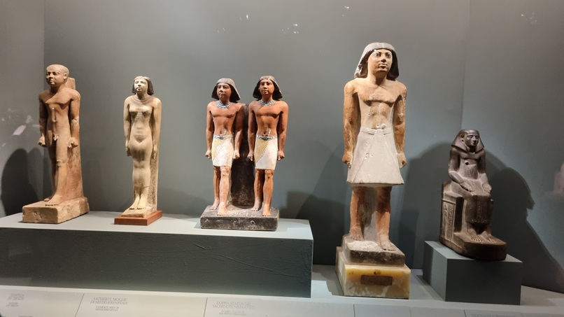 E allora vediamo qualche “immagine” di questo popolo che fa bella mostra nella Sala 6. Nella prima vetrina, con sculture conservate al museo Egizio del Cairo, troviamo c’è la statua di Tjenti in pietra calcarea dipinta (V dinastia, Antico regno), dalla tomba di Nefu, nella necropoli occidentale di Giza, funzionario rappresentato nudo come si usava per i bambini. Accanto la statua di Satmeret, in pietra calcarea, moglie di Neferherenptah, sacerdote wab (V dinastia, Antico regno), dalla tomba di Neferherenptah, nella necropoli occidentale di Giza: vestita da una tunica aderente che lascia intravedere le forme armoniose del corpo, e una grande collana che le adorna il petto. Quindi la doppia statua del sacerdote Nimaatsed, in pietra calcarea dipinta (V dinastia, Antico regno), dalla tomba di Nimaatsed, una mastaba a Saqqara, scoperta da Auguste Mariette nel 1860: ancora oggetto di discussione perché venivano scolpita una statua doppia dello stesso personaggio. Possibile rappresentasse il defunto e il suo ka. Chiude la statua di Sobeknakht Renefseneb seduto, in granodiorite (fine secondo periodo intermedio, inizio XXI dinastia), da Medinet el-Fayyum, con caratteristiche che riconducono alle cosiddette statue-cubo.