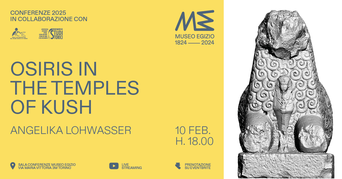 Martedì 10 febbraio 2026, alle 18, al museo Egizio di Torino, nuovo appuntamento con le conferenze organizzate con l’associazione ACME, Amici e Collaboratori del Museo Egizio. In Sala Conferenze (con accesso da Via Maria Vittoria 3m) incontro con Angelika Lohwasser su “Osiris in the temple of Kush”, in lingua inglese con traduzione simultanea in italiano in sala. L’ingresso è libero con prenotazione obbligatoria al link  https://www.eventbrite.it/…/osiris-in-the-temples-of… L’evento è disponibile anche in streaming sul canale YouTube del museo Egizio. Il programma di incontri è realizzato in collaborazione con il Dipartimento di Studi Storici dell’Università di Torino.
